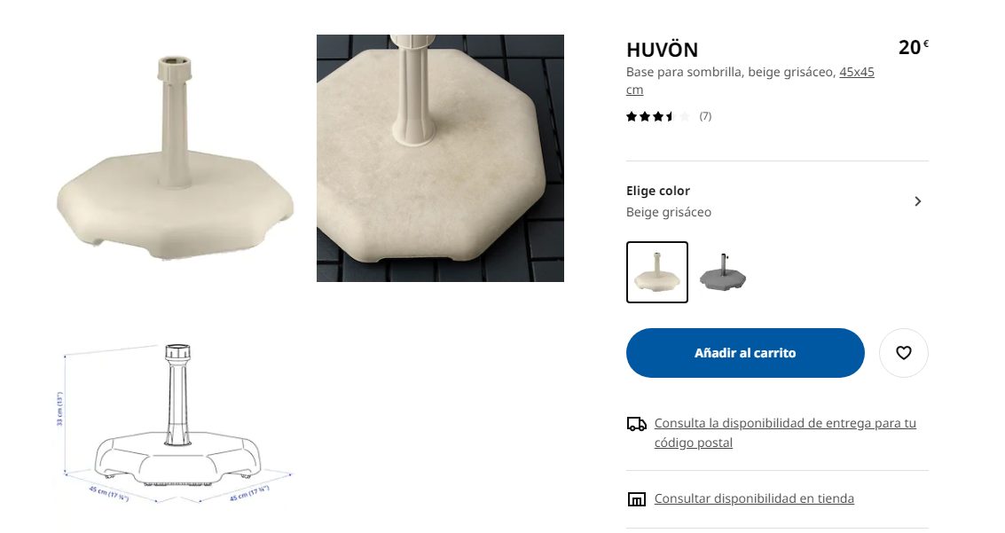 Si ya tienes la sombrilla, no puedes dejar de llevar la base para sombrilla que tienen las tiendas Ikea, en color beige grisáceo, con unas medidas de 45 x 45 centímetros. Elaborada totalmente en concreto armado, lo que impedirá su deterioro.