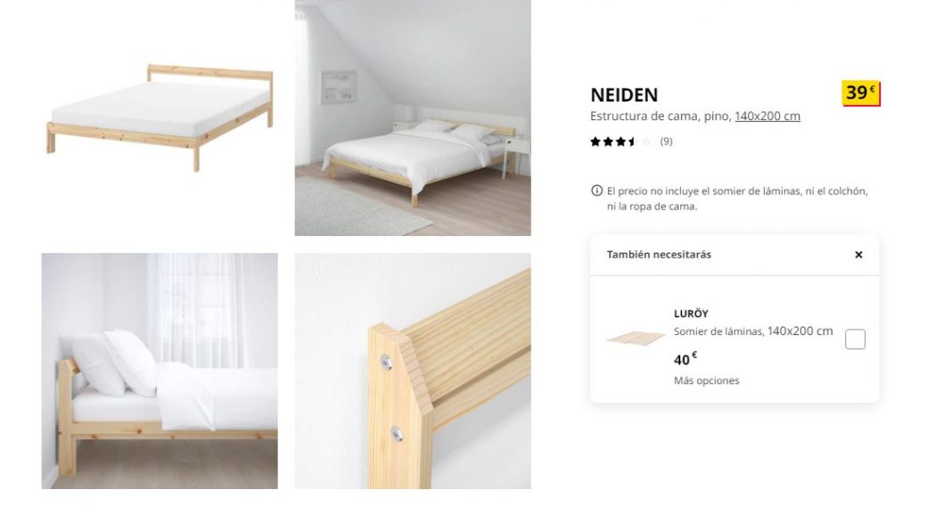 Por un precio totalmente bajo, puedes llevarte de cualquiera de las tiendas Ikea, la estructura de cama, totalmente de pino macizo, con unas medidas de 140 x 200 cm. Viene en color natural, si desea hacer cualquier combinación, podrás pintarla del color que desees.