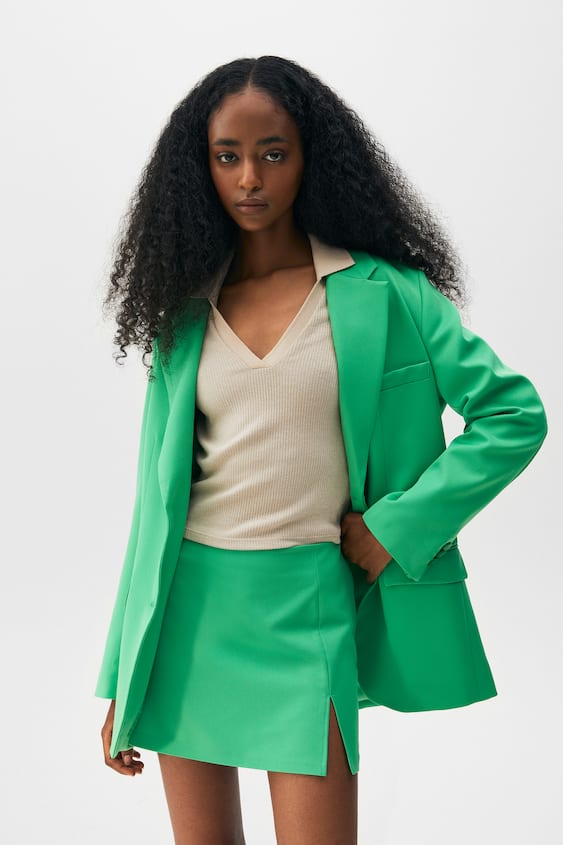Destaca todo tu estilo atrevido con esta Minifalda verde abertura. Deja que el brillo de tus delicadas piernas ilumine tu entorno, búscala en alguna de las tiendas Pull&Bear. Para cualquier tarde de primavera que desees dar un paseo modelando toda tu figura.