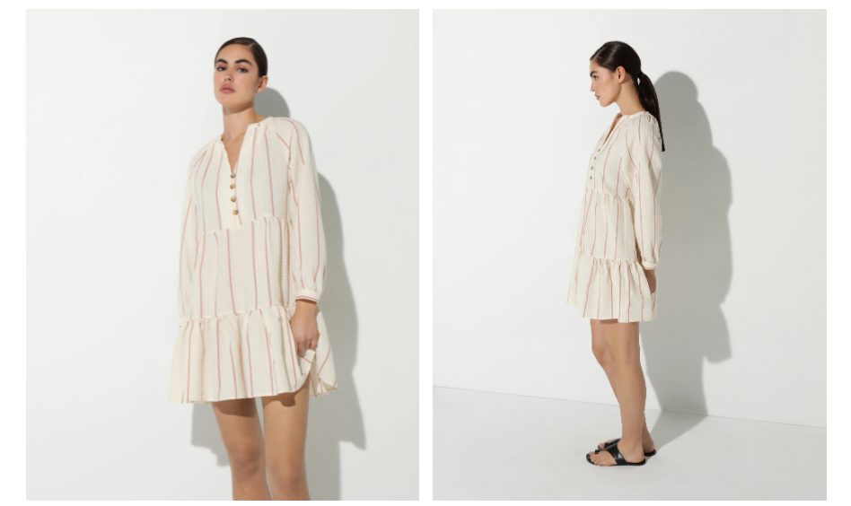 Volvemos con los vestidos cortos y con este de la nueva colección de Easy Wear, que siempre ofrece modelos al mejor precio y calidad. En este caso no dejamos el crudo y nos vamos a un modelo de manga larga a rayas con escote de pico y botones. Un vestido de lo más primaveral y para lucir sobre todo en los días ya de más calor. Está fabricado en poliéster y algodón. Su precio es de 35,99 euros y lo puedes comprar en dos clics aquí.