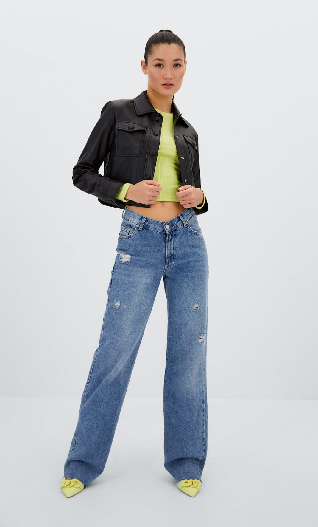 No podía faltar la Cazadora efecto piel, en esta feria de ofertas de las tiendas Stradivarius. Para acompañar cualquiera de las camisetas, top o crop que también están en ofertas en sus tiendas.