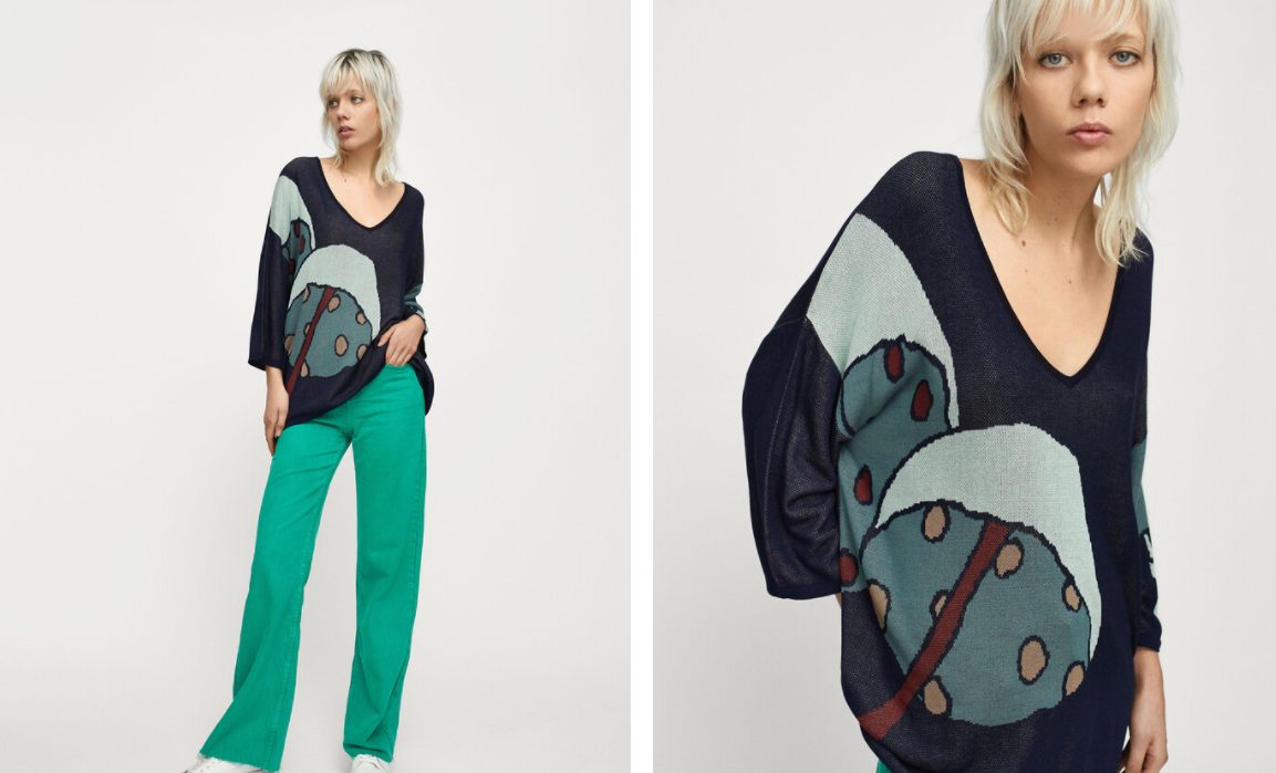 Vamos con un jersey de cuello de pico tan usado siempre en entretiempo o incluso como prenda única arriba con buen clima. Es por tanto una opción muy versátil y como ves ideal para cualquier ocasión, con un diseño alegre y original. Es un modelo Jacquard con cuello de pico y manga 3/4, disponible también en talla única. Su precio en Parfois está ahora en 29,99 euros.