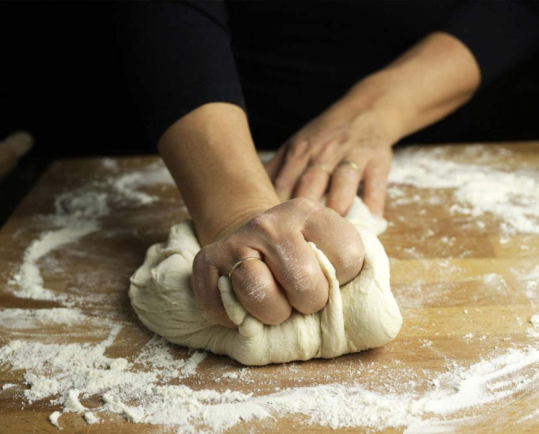 El siguiente paso es amasar los ingredientes en el bol utilizando la mano hasta formar una bola. Después pasamos esta bola a una encimera enharinada donde seguiremos amasando durante unos 10 minutos. Hay que trabajar la masa hasta que tome una textura suave y muy flexible. El amasado es otra parte fundamental del proceso. Sirve para forzar a que la gliadina y la glutenina, dos proteínas presentes en la harina, se unan para crear una sustancia nueva, el gluten. Esto será lo que le proporcionará al pan esa textura esponjosa que nos encanta.