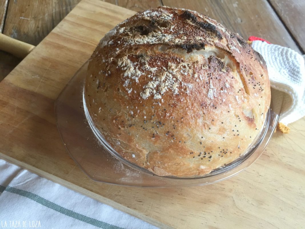 Precalentamos el horno a 220ºC arriba y abajo e introducimos nuestro pan sin sacarlo del recipiente, y con una tapa de papel de aluminio. Lo colocamos en la bandeja central y lo dejamos durante 40 minutos. En este tiempo el pan crecerá como si hubiese reposado fuera del horno, pero más rápido gracias al calor, la humedad y el reciente. Transcurrido este tiempo, quitamos la tapa de papel de aluminio y volvemos a hornear esta vez durante 25 minutos más. Y ya tendríamos nuestro bollo de pan cocido y muy esponjoso. Lo sacamos del horno y esperamos a que se enfríe un poco, para que se compacte un poco la miga y sea más fácil de cortar.