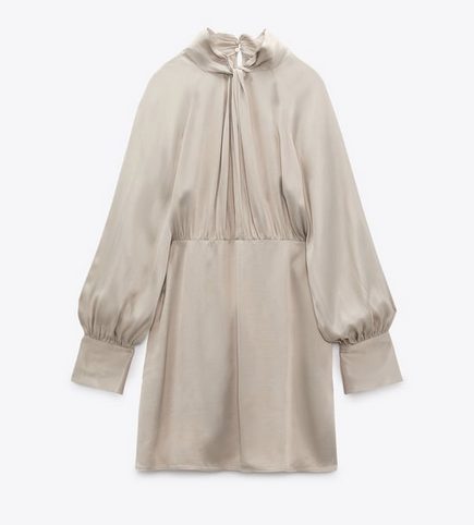 Un vestido perfecto para estos momentos en los que se busca un poco de glamour. Es corto, de manga larga y con el cuello subido decorado con un original nudo. Lleva frunces en la cintura para marcar la silueta de forma muy favorecedora. Cierra con una cremallera en la espalda camuflad en la costura y con botones en la nuca, dejando en medio una abertura. La falda es ligeramente evasé, con un bonito vuelo. Es de viscosa en un elegante color cava. Puede ser tuyo por 29,95€.