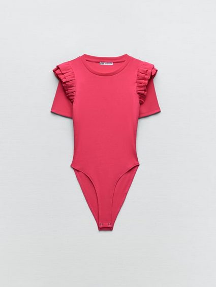 Los bodys vuelven a estar de moda, y se han convertido en los grandes protagonistas de muchos looks. Este de Zara destaca por los detalles de volantes en las mangas, que le dan un aire original y divertido a un sencillo look básico. Perfecto para combinar con jeans, shorts o con faldas vaporosas. Tiene el cuello redondo y cierra en el bajo con botones a presión. Está fabricado con un 95% y 5% elastano para un ajuste óptimo. Está disponible en naranja, rojo, blanco y negro, por 12,95€.
