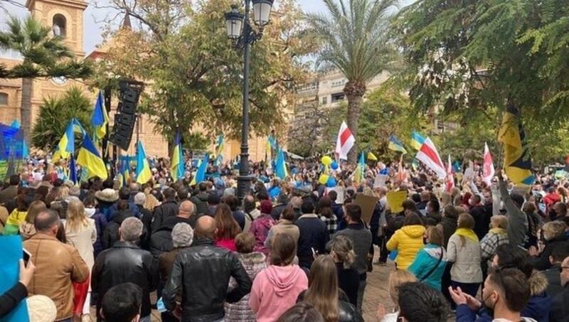 La localidad alicantina de Torrevieja –donde reside una importante colonia de ciudadanos ucranianos– ha acogido este domingo una concentración en la que numerosos ciudadanos han llenado la plaza de la Constitución de la población para expresar su rechazo al ataque de Rusia contra Ucrania.