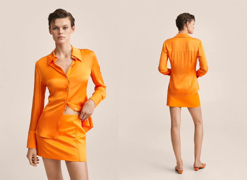 Una alternativa a los anteriores es esta camisa fluida satinada, un modelo que se encuentra confeccionado en 100% viscosa que se vende en Mango tanto en acabado de color rojo como en naranja. Su precio de venta actual es de 29,99 euros.