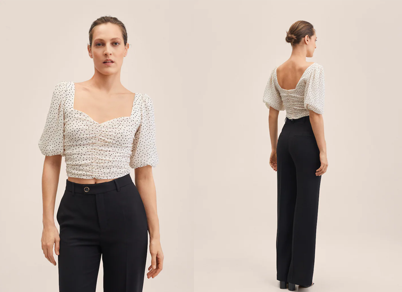 Confeccionada en 100% poliéster, es un modelo de tejido de gasa con diseño crop y detalle fruncido central, con estampado de topos, escote corazón y manga corta abullonada. Posee un cierre de cremallera invisible en la parte posterior.