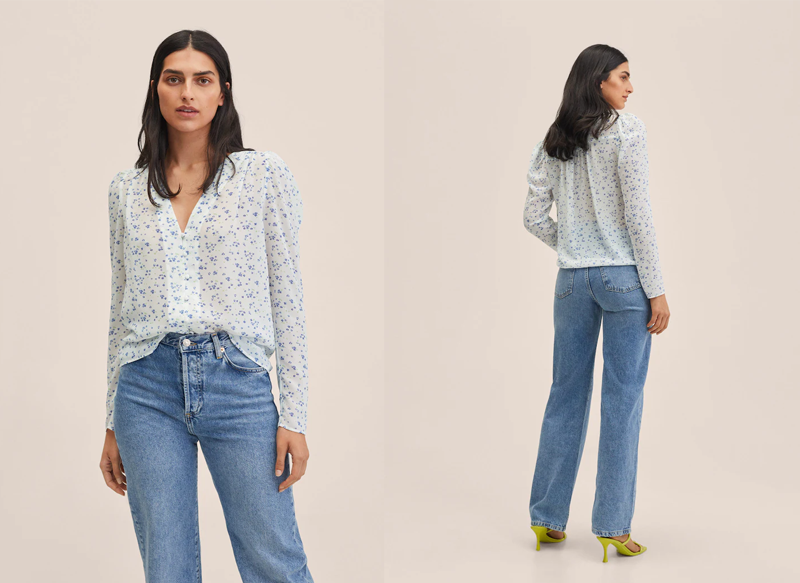 Esta blusa manga abullonada estampada es una de las novedades que podemos encontrar en la firma catalana. Se encuentra disponible tanto en color blanco roto como en azul con estampado de flores o de topos según el modelo elegido.