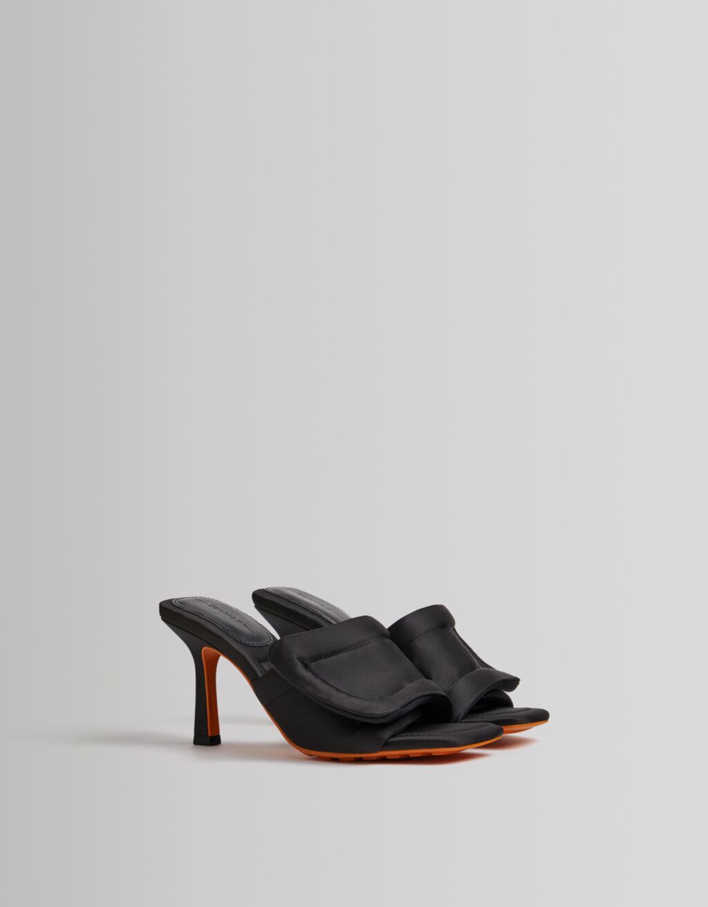Se trata de unas sandalias tipo mule, una tendencia que lleva varias temporadas triunfando, con un original tacón acolchado que recuerda mucho a la lujosa firma de calzado Bottega Veneta. Son de color negro, lo que las hace muy versátiles y fáciles de combinar con cualquiera de tus prendas.