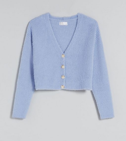 Las chaquetas tipo rebeca son un must, y son ideales para poner en primavera, por encima de una camiseta, o con los botones cerrados, como si fuese un jersey con escote de pico. En Bershka quedan todavía tallas de este bonito modelo con efecto pelo, muy suave al tacto y agradable de llevar sobre la piel. Es una chaqueta femenina, delicada y perfecta para levantar un outfit informal. Está disponible en blanco, beige y azul, con un precio rebajado en un 30%. Ahora cuesta 13,99€.