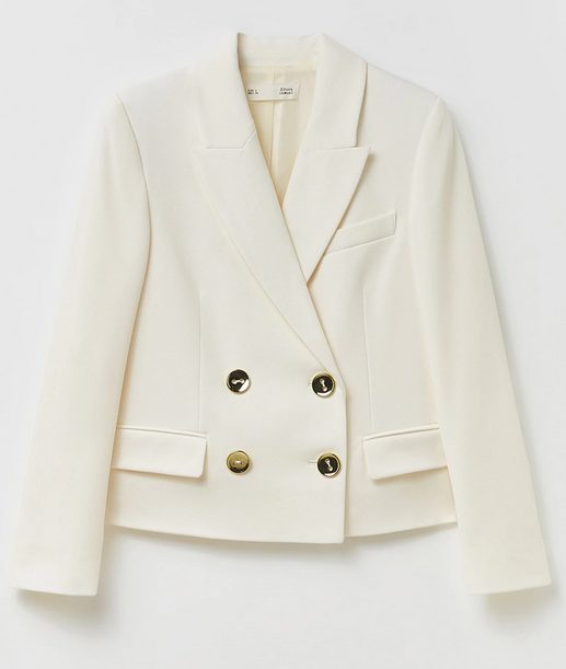 Las prendas cortas siguen siendo tendencia y esto se refleja en prendas como las chaquetas. Esta blazer de Sfera es de corte ligeramente corto, con una forma amplia y suelta, con solapas y cierre cruzado con doble botonadura en dorado. Las mangas son lisas y tiene tres bolsillos falsos, dos en los laterales y uno en el pecho. Es de un bonito y primaveral color blanco que le dará un punto de elegancia sofisticada a tus looks. La puedes conseguir en El Corte Inglés por 35,99€. Busca tu talla en el siguiente link.