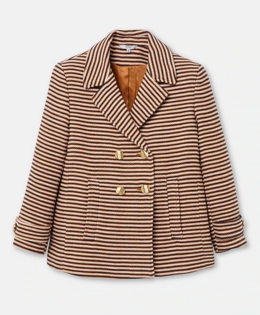 Las rayas marineras se cuelan en las chaquetas americanas. Si amas el estampado de rayas, esta blazer se convertirá en una de tu favoritas. Es de colores azul, naranja y blanco, con una bonita manga tres cuartos con trabillas en los puños. Cierra con doble botón y tiene dos bolsillos verticales. El corte es ligeramente evasé, con un toque muy femenino y favorecedor. Sublima tus estilismos más básicos completando tu conjunto con esta cómoda chaqueta, fabricada en algodón y poliéster. Tiene un precio de 59,99€ y la puedes conseguir aquí.