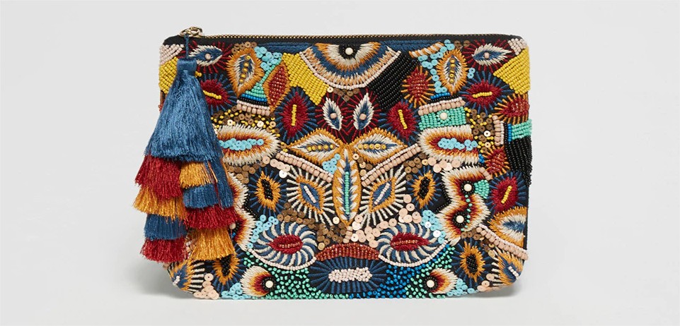 Se trata de un modelo en color negro con bordado caleidoscopio multicolor al que no le faltan lentejuelas. No le falta un agarrador con doble borla de flecos de llamativos colores. Si quieres hacerte con esta, que sepas que aquí es donde vas a poder encontrarla.
