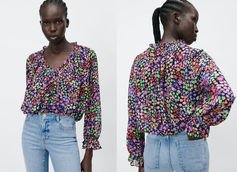 A la venta por 25,95 euros, es una blusa de escote pico y manga larga que destaca por su colorido, así como por contar con un detalle de acabados elásticos con volantes.