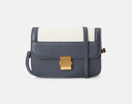 Siguiendo con el concepto de bandolera mini, la marca LT nos trae esta propuesta un poco más sofisticada, en color azul marino con un elegante broche en color dorado. Tiene un detalle blanco a contraste, y un asa larga regulable, con solapa y cremallera. En el interior tiene un bolsillo y las medidas son 7 (ancho) x 21 (fondo) x 14 (alto) cm. Perfecto si buscas un bolso clásico muy versátil que puedas combinar con todos tus looks. Lo tienes en El Corte Inglés por 49,99€. Este es el enlace.