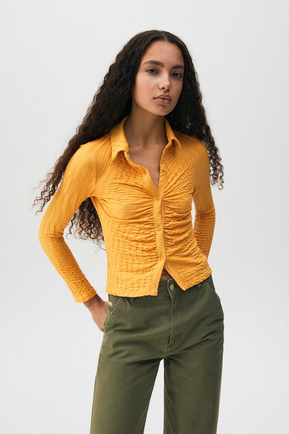 Siempre debes tener en tu closet la prenda de vestir ajustada a tu cuerpo, que refleje tu estilo elegante detallando tu perfecta silueta. Visita una de las tiendas Pull&Bear y llévate por solo 12,99 euros la Camisa manga larga frunce.