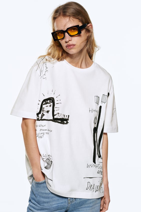 Una camiseta casual y juvenil tiene Zara en sus tiendas. La camiseta dibujo bordados, en tamaño algo largo y diseño juvenil, algo deportiva, fácil de combinar y poder llevarla donde desees en esta primavera.