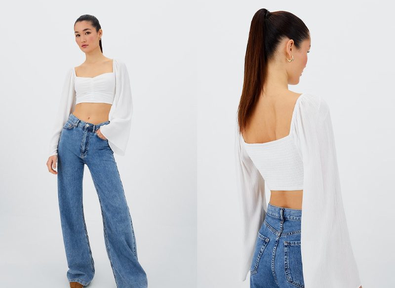 En el amplio catálogo de la cadena de tiendas del grupo Inditex cabe destacar esta blusa manga larga acampanada. Se vende en color blanco y en negro y está disponible en tallas XS a XL, teniendo un precio de 19,99 euros.