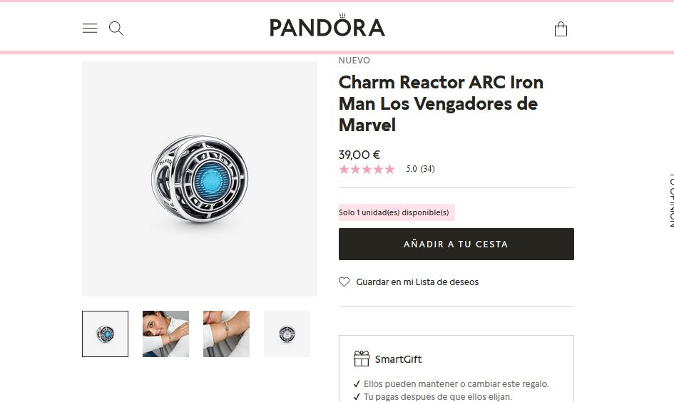 Representando el corazón artificial de Iron Man, nuestro charm en plata de primera ley se presenta con esmalte de color azul transparente. Y, detalles texturizados que recrean el look de maquinaria mecánica. En la parte trasera se han grabado las icónicas palabras que Tony Stark comparte como Iron Man con su hija: «I love you 3000». Añade este charm junto a otros de tus héroes favoritos a nuestra Pulsera Pandora Moments. Si desean comprarla solo deben entrar a Pandora por 39,00 €.