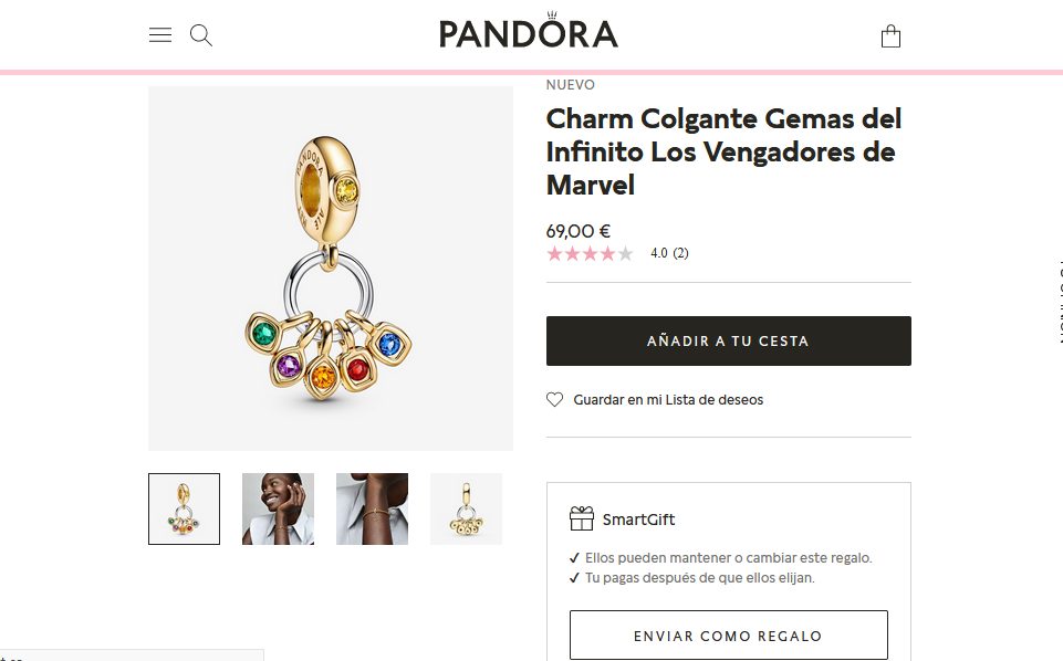 Este charm en plata de primera ley con un recubrimiento electrolítico de oro de segunda ley de 14k. Además, se ha decorado con cristales sintéticos de colores que representan las gemas más codiciadas del universo. Cada cristal representa a un poder. Añade este charm a nuestra Pulsera Pandora Moments con Cierre Logo Los Vengadores de Marvel. Si desean comprarla solo deben entrar a Pandora por 69,00 €.