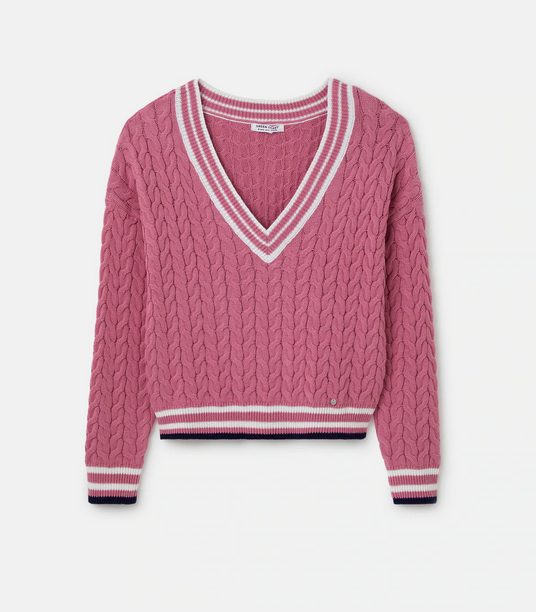 Los jerséis tipo college o con inspiración de uniforme escolar están muy de moda, así que esta es una gran oportunidad para hacerte con uno. Este que te mostramos es de la marca Green Coast, tiene un diseño con el clásico cuello de pico y punto trenzado. Lleva las terminaciones con detalles de rayas y está disponible en color azul marino y en rosa. Un jersey perfecto para combinar con tus vaqueros preferidos y conseguir un conjunto estiloso y a la moda. Lo tienes en El Corte Inglés por un precio de 23,99€. Aquí puedes elegir talla y modelo.