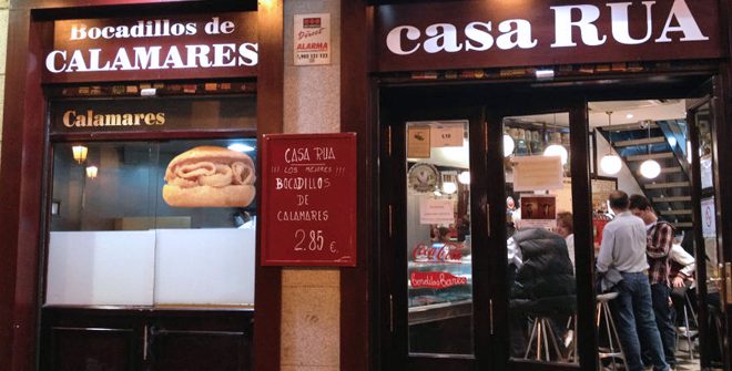 En Csa Rúa casi nunca hay sitio y sí muchas colas de personas esperan por su bocadillo de calamares. Esto ya te puede ir haciendo una idea de lo famoso que es el bar y de la delicia que se esconde tras su puerta. Ubicado en pleno centro de Madrid, podrás adquirir una opción suculenta y de gran calidad por tan solo 2,85 euros.