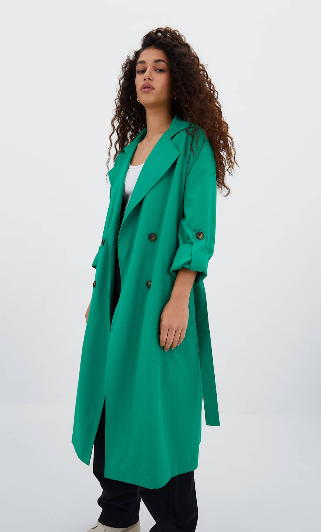 Si hay una prenda que se puede convertir en la reina de la primavera es el trench. Este, de Stradivarius, destaca por su diseño largo y fluido así como por su intenso color verde, que captará todas las miradas. Una gran elección si quieres destacar en materia de moda que podrás conseguir por solo 39,99 euros.