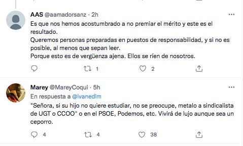 “Los sindicatos están tan de capa caída que ya tienen que tirar de gente que no sabe ni leer. Miren qué ridículo el del secretario general de @UGT_Comunica en Melilla”, decía un usuario en un tuit. Algunos usuarios también han querido defender a los dos secretarios: “Se cree usted superior a estas personas? Pretende hacer mofa? Es gracioso?Nunca se ha puesto usted nervioso ante la multitud o es un ser supremo? Pretender hacer un chiste de alguien que no se expresa bien para intentar quedar “por encima”denota mala educación y poco saber estar”.