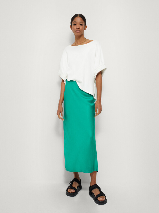 Los acabados satinados cuentan con la particularidad de resultar elegantes y fáciles de llevar al mismo tiempo. Además, otra de las características por las que llama la atención esta falda midi de Parfois es por su color verde brillante, que captará todas las miradas. Por supuesto, su precio, de solo 29,99 euros, tampoco te dejará indiferente.