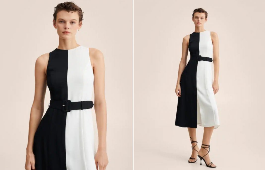 El corte midi también es el gran protagonista en este bonito vestido bicolor de Mango que se forma a partir de los tonos blanco y negro para crear contraste. Además, se adapta a la perfección al cuerpo gracias al cinturón y por su diseño, que estiliza la figura. Con un precio de solo 49,99 euros, será una gran inversión.