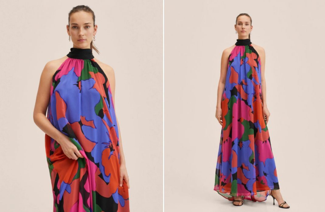 Los vestidos fluidos son la apuesta fuerte para la primavera. En este caso, este de Mango destaca además debido a su bonito estampado floral, compuesto por colores tan alegres como el fucsia, el naranja o el lila. Largo hasta abajo y atado al cuello con un lazo, será una prenda diferente que puedes conseguir por 79,99 euros.