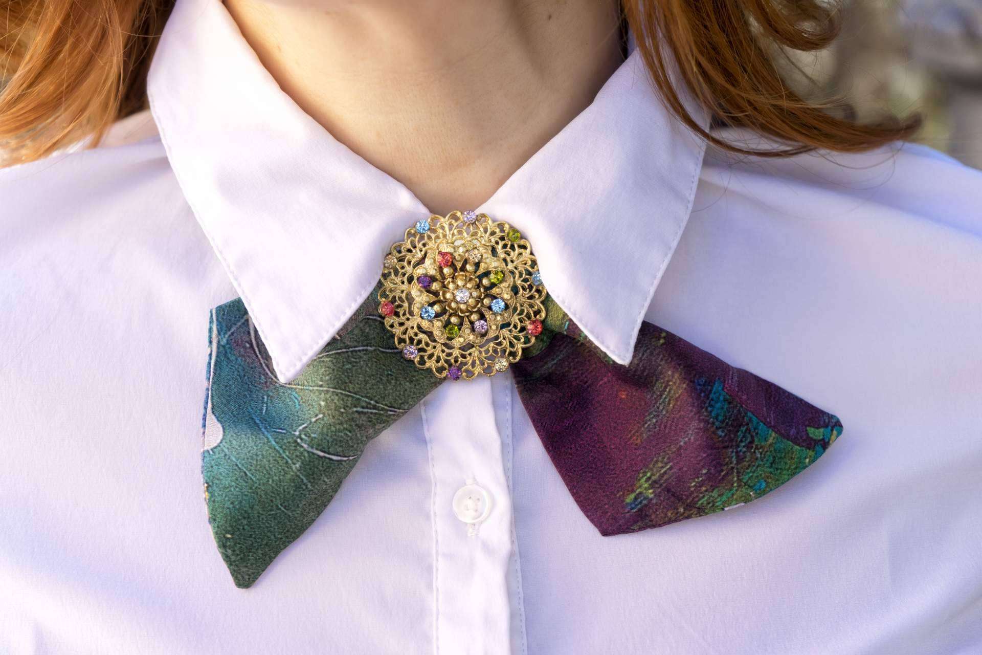 Full & Briss asegura que el lazín se puede usar como un complemento para los atuendos con escotes amplios sujetado con un broche colocado a un lado o de manera frontal. Esta pieza también puede usarse directamente debajo del cuello de la camisa, al estilo de las pajaritas femeninas.