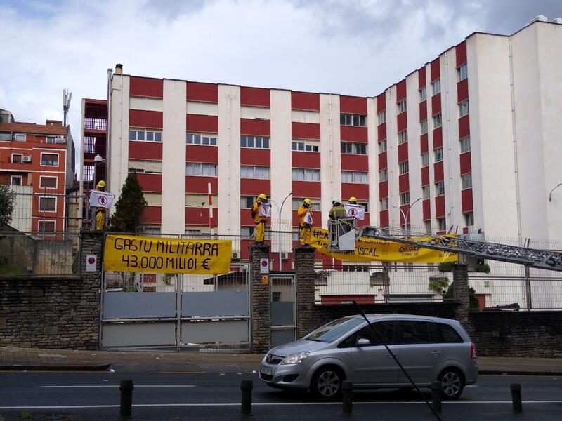 En el transcurso de la acción cuatro activistas se han encaramado a los muros del cuartel militar de Juan de Garay y han desplegado dos pancartas en las que se podía leer «Gasto millitarra 43.000 miloi €, egizu #eragozpenfiskala» (gasto militar 43.000 millones, haz # objeción fiscal) y «la equivalencia entre el gasto de un tanque Leopard y 6 colegios».