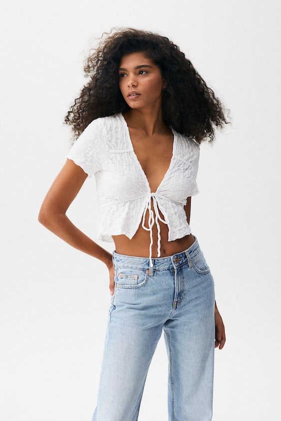En diseño cropped, con mangas cortas, cuello pico amplio, sin botones, cierra a nivel del busto con lazada. Totalmente casual y puedes darle un look atrevido y juvenil. Destaca tu bronceado, su color blanco hará contraste con él y llévalo a tu closet por solo 15,99 euros.