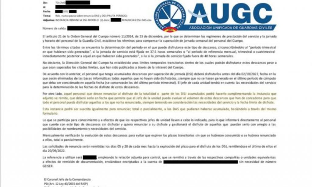 La Dirección General de la Guardia Civil quiere que los agentes renuncien a sus días de descanso. A través de un correo electrónico, se está difundiendo una comunicación entre las unidades de guardias civiles en la que les piden que renuncien voluntariamente a los días libres que les corresponden por superación de la jornada laboral. Así, dan la opción de que el personal que lo «desee» pueda renunciar de forma total o parcial a los descansos generados por la superación de la jornada laboral. Un mensaje que ha sido denunciado por la Asociación Unificada de Guardias Civiles (AUGC) y que lleva circulando desde mediados del mes de marzo. A esta comunicación además de pedirle a la tropa que renuncie a sus correspondientes descansos, les adjuntan el documento de renuncia. La asociación considera que esta no es forma de hacer frente a la falta de personal, que desde el Ministerio de Interior están tratando de tapar eliminando los descansos.