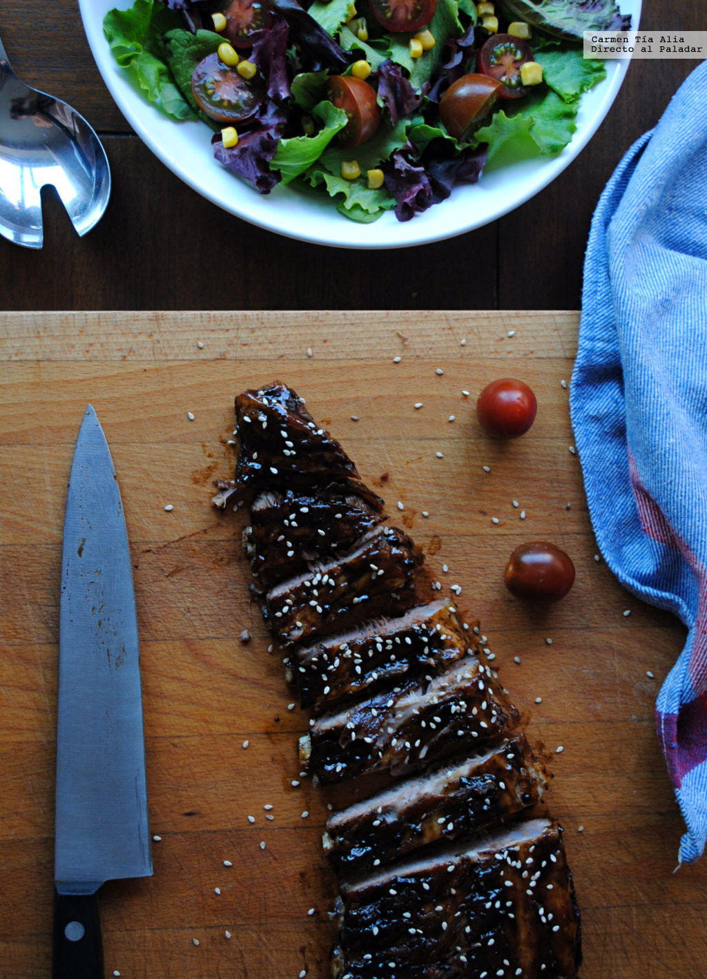 En un envase preparamos una mezcla de miel de ajo negro, aceite de oliva, salsa de soja y kétchup, mezclamos bien hasta tener una masa homogénea, cubrimos la costillas por ambos lados con un pincel con la misma, la llevamos al horno en una bandeja cubiertas con papel aluminio a 190 grados por 15 minutos. (Guardemos el líquido inicial ara cualquier receta)