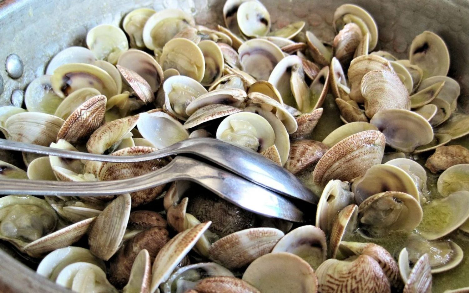 Ahora que el ajo y la harina están ya bien integrados, puedes empezar a verter tanto el vino como el caldo caliente que ha salido de las alcachofas. Después, dejar hervir todo junto durante más o menos un minuto. Una vez que acabe este tiempo, puedes agregar también las almejas y mantener todo junto en el fuego. El tiempo terminará cuando estas se abran, pues significará que ya están listas.