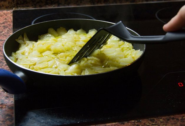 Y una vez que tenemos la mezcla hecha, hay que saber otra serie de cuestiones para poder sacar una tortilla de patatas cremosa. Por ejemplo, el tiempo de freírla en la sartén. Lo primero que tienes que hacer es verter otro chorrito de aceite en la sartén y espera a que esté muy caliente.