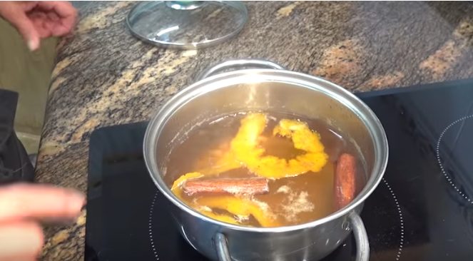 En lo que dejamos reposar la masa de las rosquillas de Semana Santa, vamos haciendo el almíbar con los ingredientes que te mencionamos anteriormente. Ponemos una olla al fuego a temperatura media con agua. Añadimos el azúcar, la miel (opcional), dos palitos de canela, la piel de naranja muy bien lavada y el licor de anís, por supuesto si se quiere. Mezclamos hasta hervir.