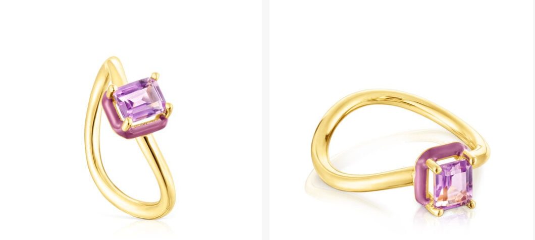Otro de los anillos más emblemáticos que podrás encontrar en la sección de novedades de Tous es este. Bajo la colección Vibrant, se trata de una pieza elaborada en plata vermeil, de ahí su bonito tono dorado, con una gran amatista en el centro, capaz de acaparar toda la atención. Con un precio de solo 89 euros, también se convertirá en tu favorito.