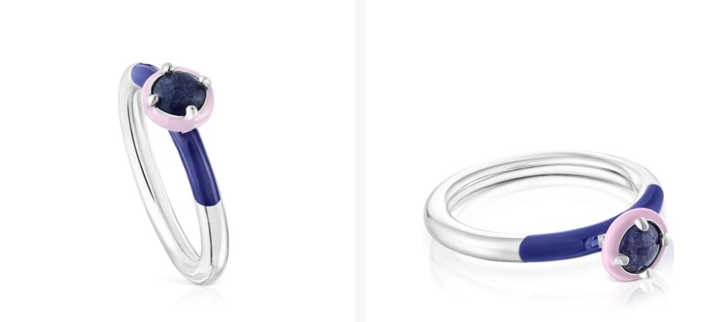 Este quizá sea uno de los anillos más originales que podrás encontrar dentro de esta sección especial de Tous. Elaborado en plata, cuenta con una pieza de lapislázuli en el centro y detalles de esmalte en el color very peri, el más buscado de la temporada. Su precio, de solo 75 euros, también te hará querer añadirlo a tu joyero esta primavera.