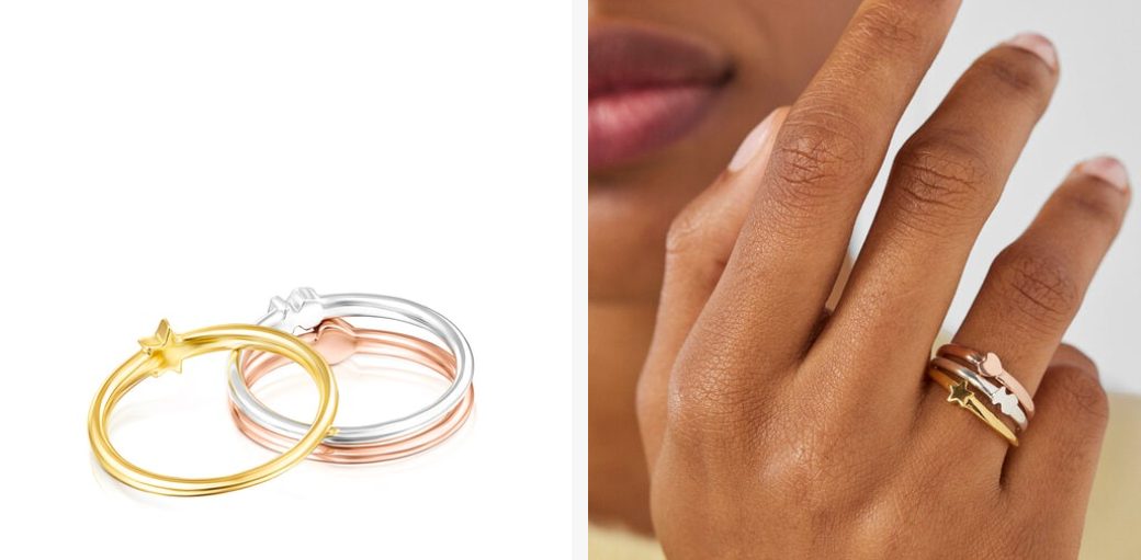 A la hora de combinar, lo mejor es contar con un buen set de anillos que puedas lucir tanto juntos como separados. Una buena opción será apostar por este pack de Tous. Compuesto por tres anillos en diferentes colores, cada uno cuenta con un motivo que refleja tu personalidad. Además, te puedes llevar los tres por solo 95 euros. No necesitarás nada más.