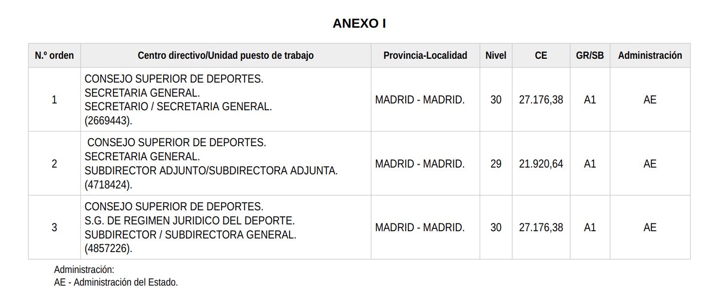 «Esta Presidencia acuerda anunciar la provisión, por el procedimiento de libre designación, de los puestos de trabajo que se detallan en el Anexo I de esta Resolución, con arreglo a las siguientes bases», detallan desde el BOE. El Consejo Superior de Deportes colocará a nuevos funcionarios nivel 30 en puestos clave como secretario general o subdirectores adjuntos. Y la decisión la tomará Franco, para alegría de todos sus amigos más cercanos. Este anuncio se ha dado esta Semana Santa. Pero no es la primera vez que Franco coloca a los suyos en posiciones clave, pues en el partido lo hizo con mucha alegría.
