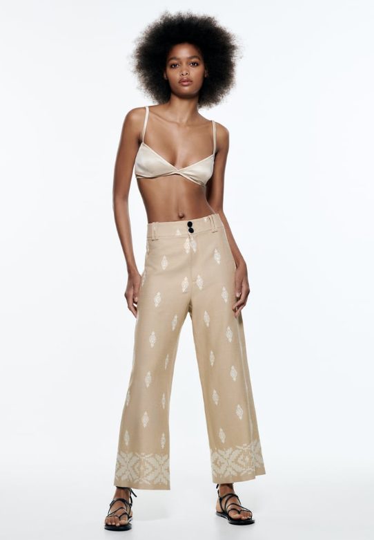 Un verano más, el lino es uno de los tejidos que no pueden faltar en tus prendas cuando se acerca el buen tiempo. En este caso, desde Zara lo incluyen en pantalones como este, de diseño culotte, de un bonito tono beige de base con estampados en blanco muy elegantes. Con un precio de solo 39,95 euros, será toda una inversión.