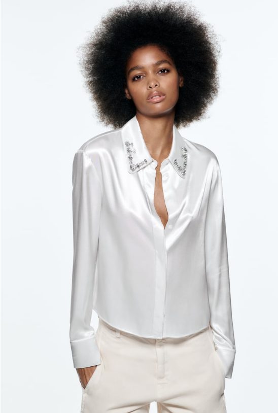 Las camisas se conviertien en la prenda central de las que más saben de moda y, si además eres una de esas personas a las que les gusta destacar, no te querrás quedar sin esta, de diseño satinado, de Zara. Llama la atención, sobre todo, por sus detalles de joya en el cuello, que captarán todas las miradas. Te puedes hacer ya con ella por solo 35,95 euros, triunfarás allá donde vayas.