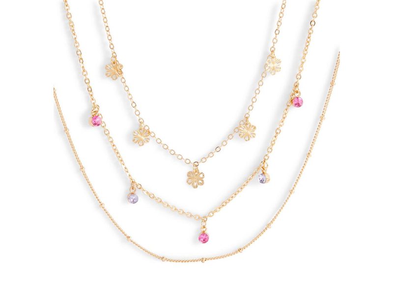 Este collar dorado de triple cadena es uno de los productos de bisutería que puedes encontrar en Primark y que puede ser el toque definitivo para tu look. De color dorado, cuenta con dijes de flores y elementos de colores que le dan un aspecto especial.