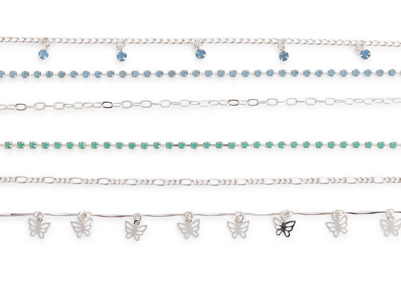 En Primark también puedes encontrar otros tipos de packs de bisutería, como es el caso de este pack de seis pulseras plateadas con dijes de mariposas y cadena de eslabones. Con este conjunto de pulseras podrás encontrar la ideal para cada ocasión e incluso combinar varias de ellas al mismo tiempo.