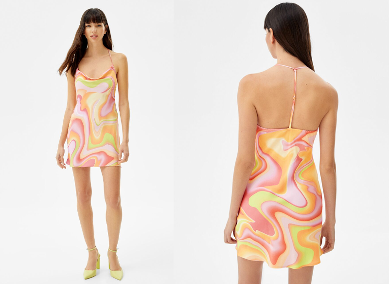 Si te gustan los vestidos con un diseño más llamativo, este vestido mini escote satinado drapeado es una opción a considerar. Disponible en tallas XS a XL, se puede encontrar en las tiendas de la firma del grupo Inditex por un precio de 19,99 euros.